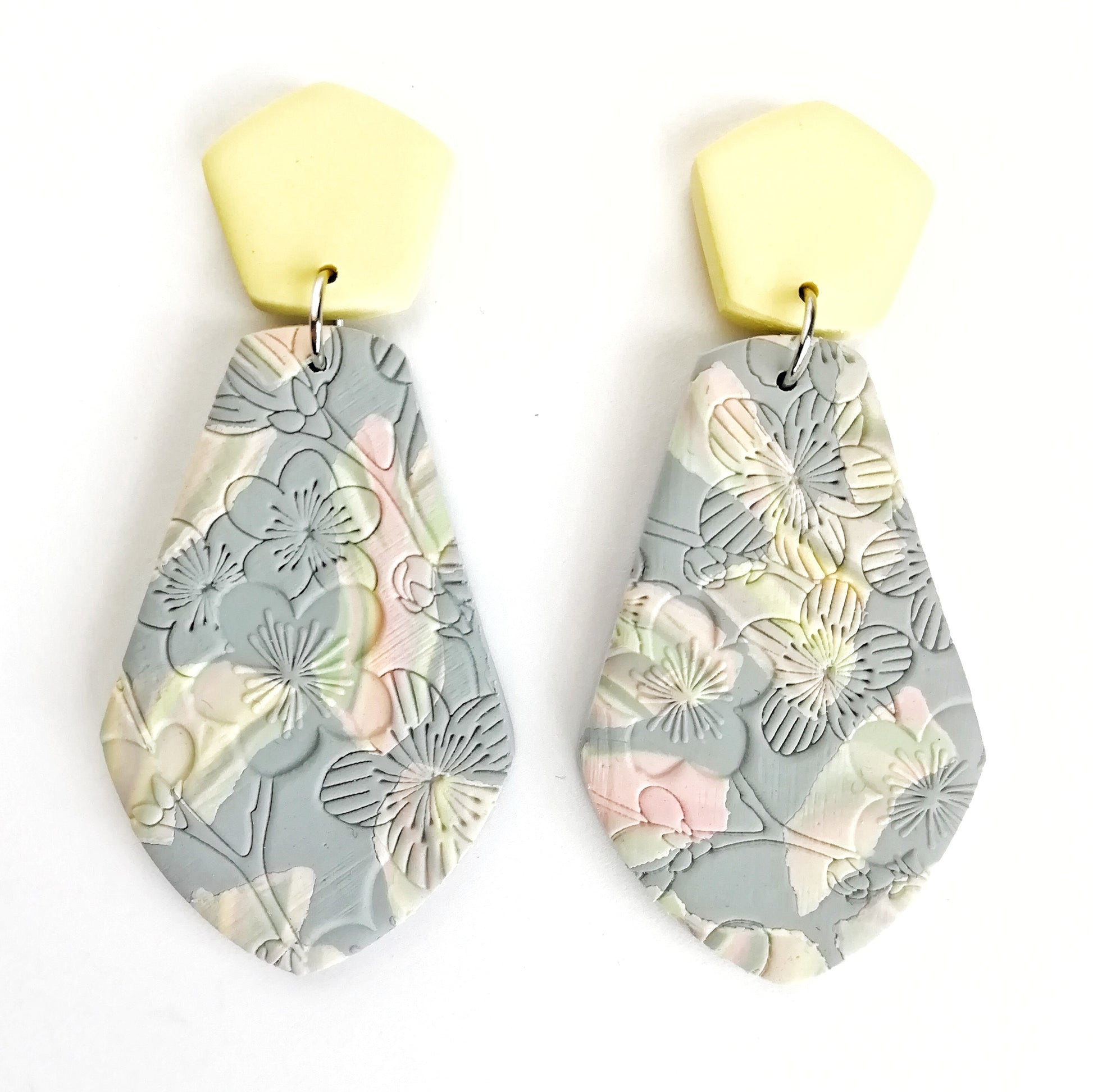 Each pair in the Blush Reverie Collection is hand-sculpted from marbled polymer clay, each piece blends soft pastel tones like a painted dream, adorned with subtle texture for quiet elegance. No pair is the same.