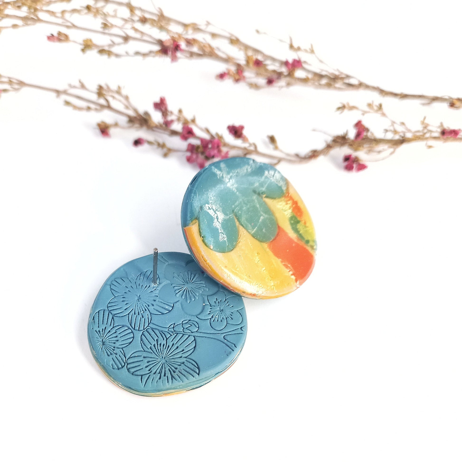 Individually sliced and rolled by hand, no two patterns are ever the same — every earring tells its own quiet story. The reverse side features a subtle pressed clay pattern with an embedded earring post, adding an artistic surprise with every movement.